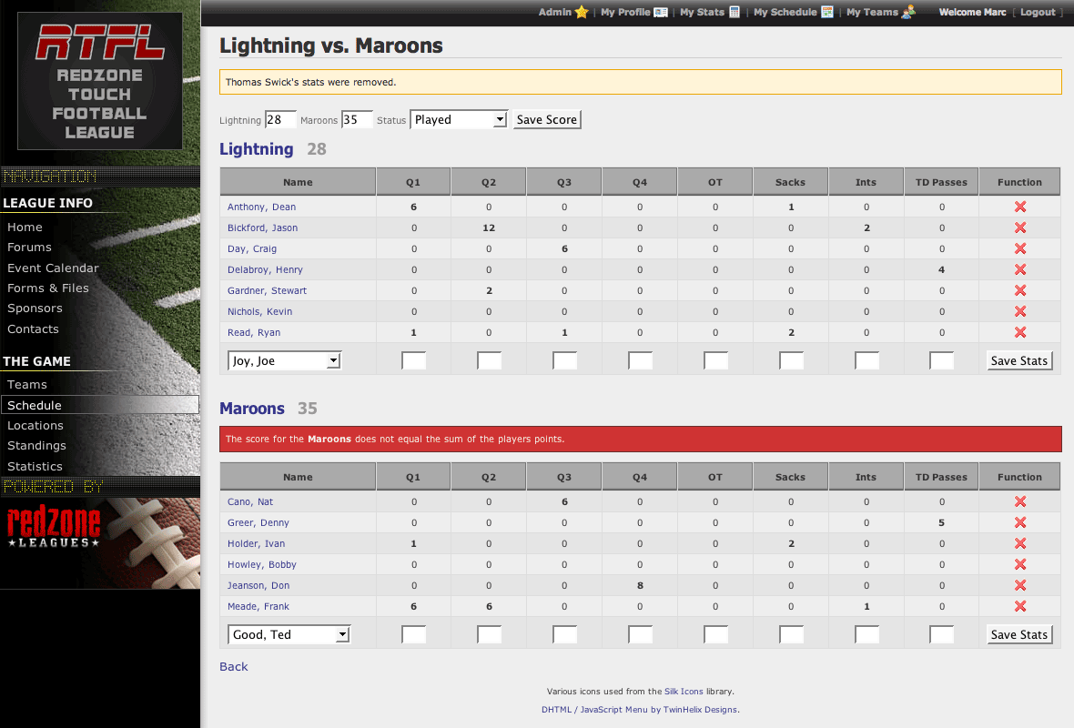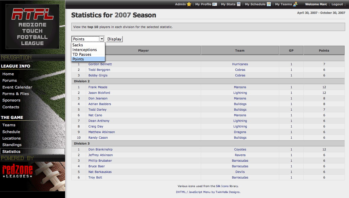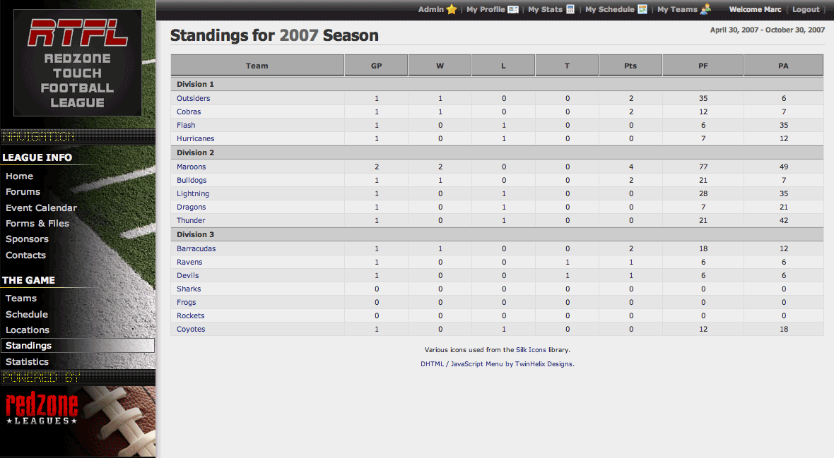 Every season's statistics are always available to you. Do you want to compare your leading scorer's stats to last year's numbers? Do you want to see the previous years standings to see how a team has improved over time? These types of things are made easy with Redzone.