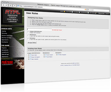 In a smaller league, you may be the only person administering your website. In a larger league, you might want to have a few people help you out. With Redzone's task delegation facilities, you can assign roles to people such as statisticians or schedulers. These people can then do the functions that you give them access to, but you can still maintain the site as the "super user".